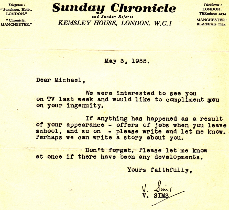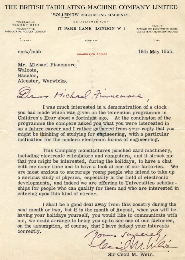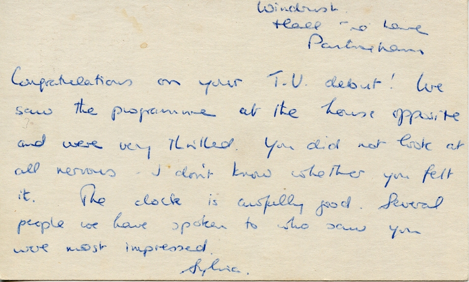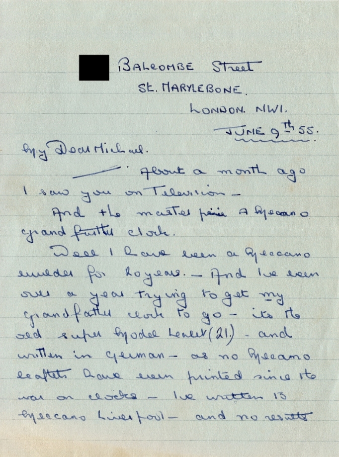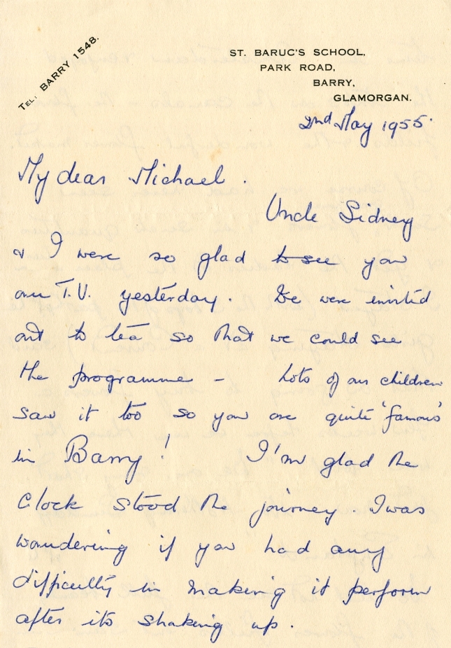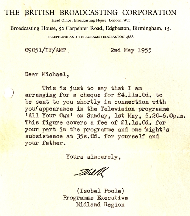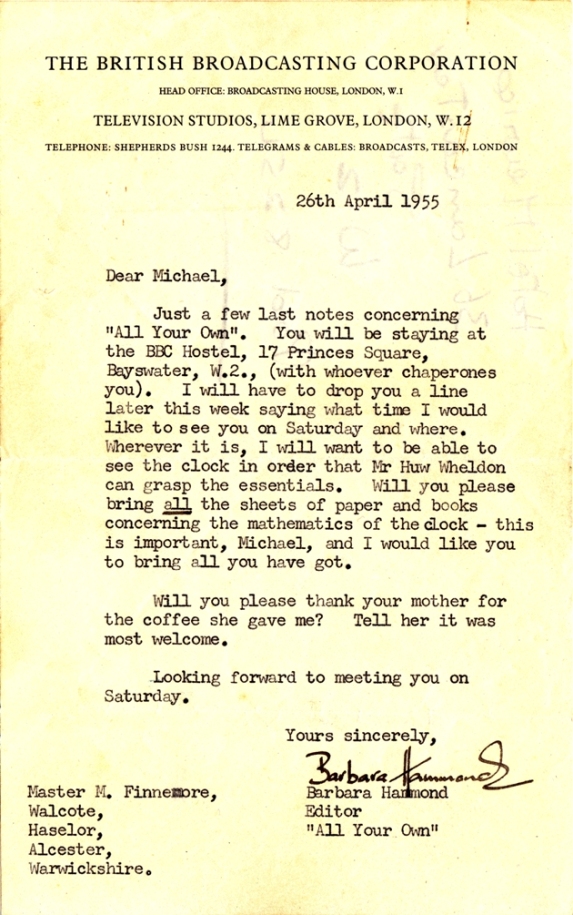 This is the time that Michael had to be at the BBC Television Studios with the clock in London on Saturday 30th April 1955. The next day will be the live broadcast of "All Your Own" on Children's Hour. |