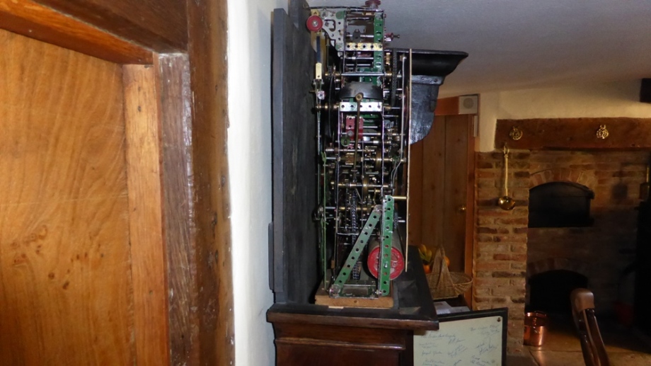 | Michael with his clock that now stands in the kitchen of an old manor farmhouse in Buckinghamshire. | Meccano strips bolted together have replaced the