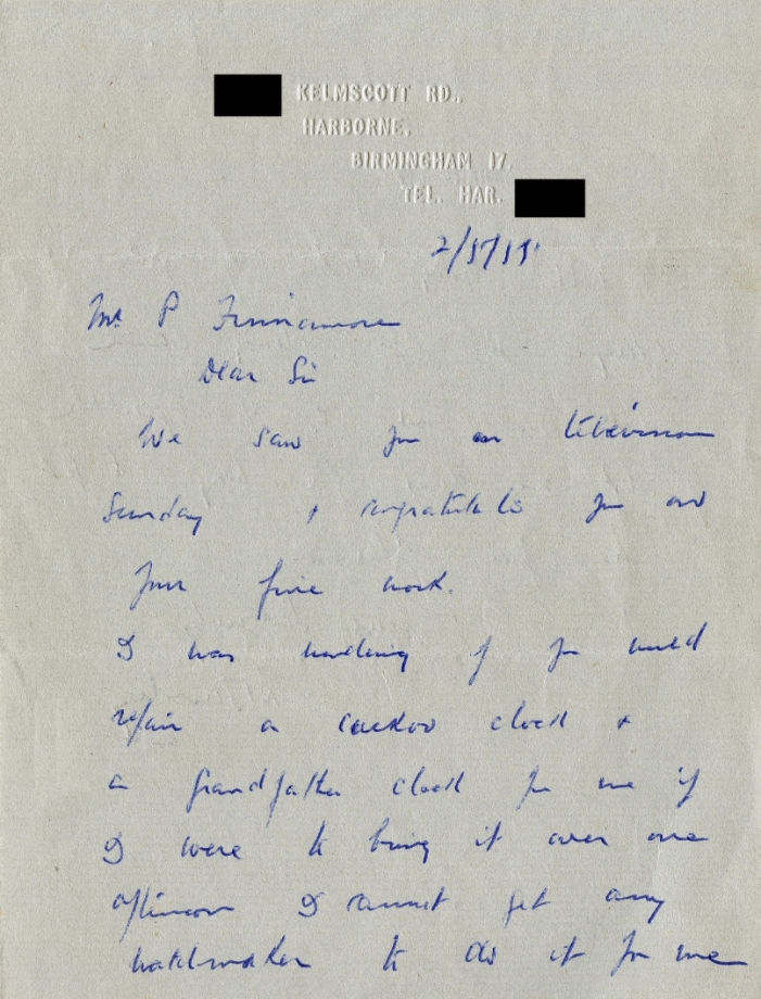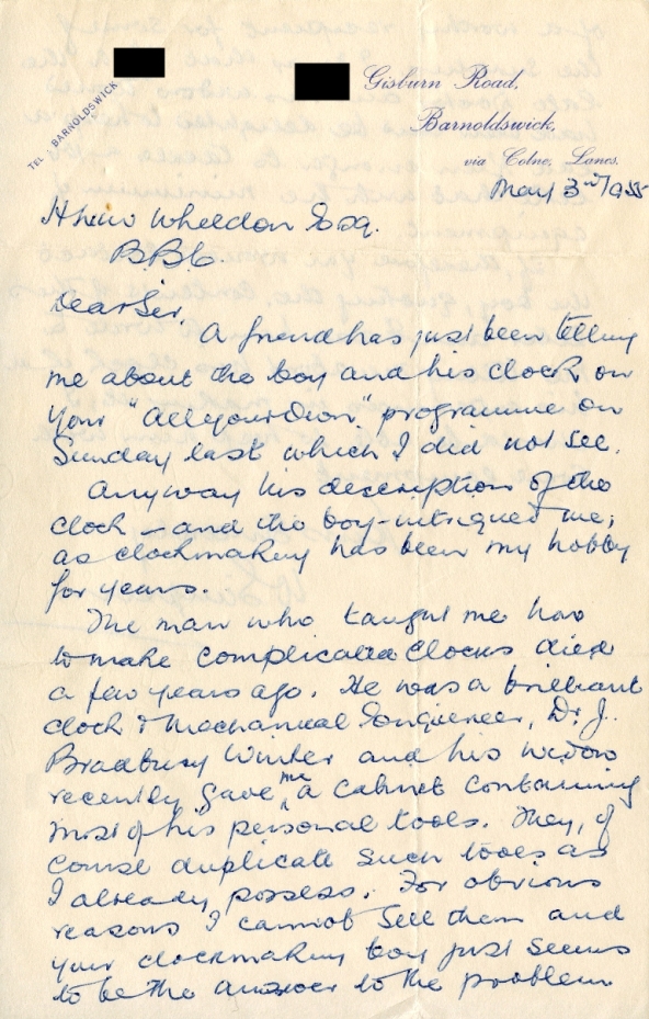 | After the programme there were letters offering Michael clock making tools and old clocks. People wanted information and clock repairs done. They also wanted to come and see the clock in a farmhouse situation. | |