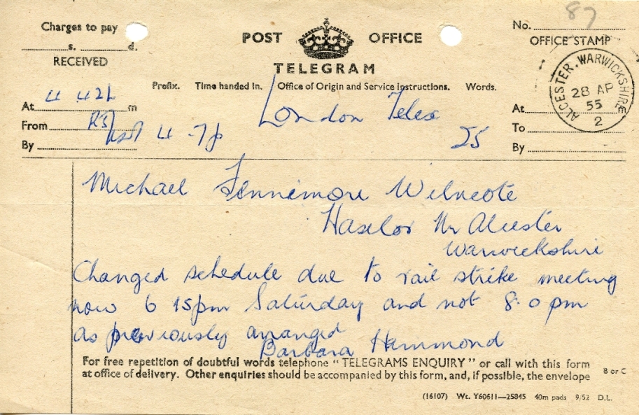It was very nearly dinner-time on the first day of the Easter holidays, and I was already beginning to feel bored. Then there was a knock at the door and to my surprise a telegram for me. (Dated 7th April 1955.) I