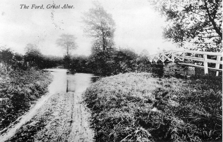 The wooden foot bridge on right of picture, crossing the River Alne. | |||