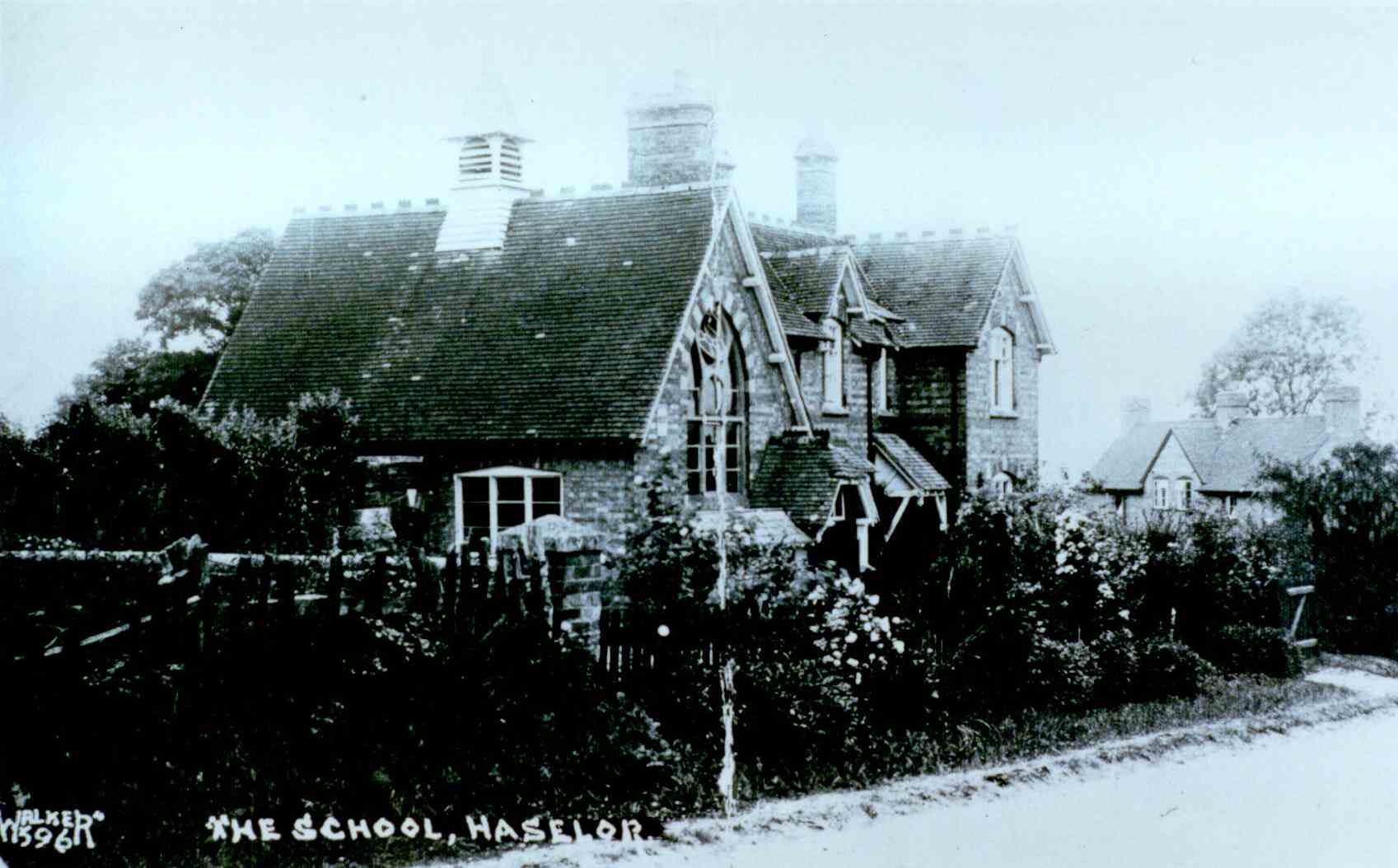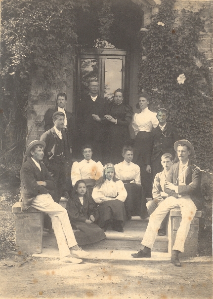 In those days the Vicarage was the centre of village life in Haselor. The house, not old as houses go, for my Father had it built, yet has a certain mellowness in its warm red brick which gives an impression of age, as it stands today, pleasantly modernised and dreaming in the spring sunshine. The rooks still build in the elms nearby. Across the lane and up the steep incline the little church stands, gathering around it, on weathered, crooked tombstones, the names of many who were the life and essence of the village community into which, in 1867 I was born. I was the fourth arrival in a family which, year by year, with almost clockwork regularity increased until it reached a living total of fourteen - six girls and eight boys.