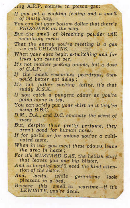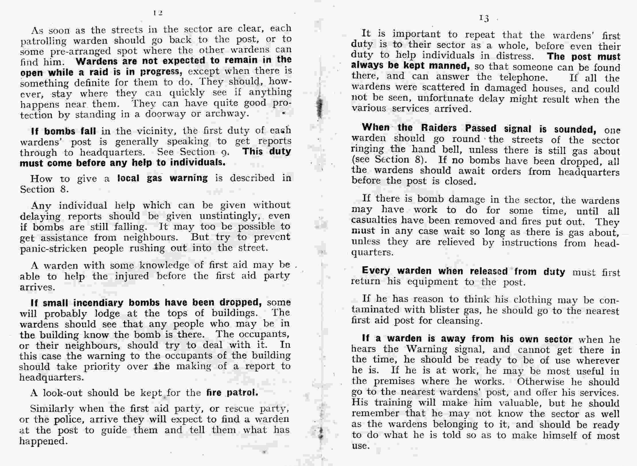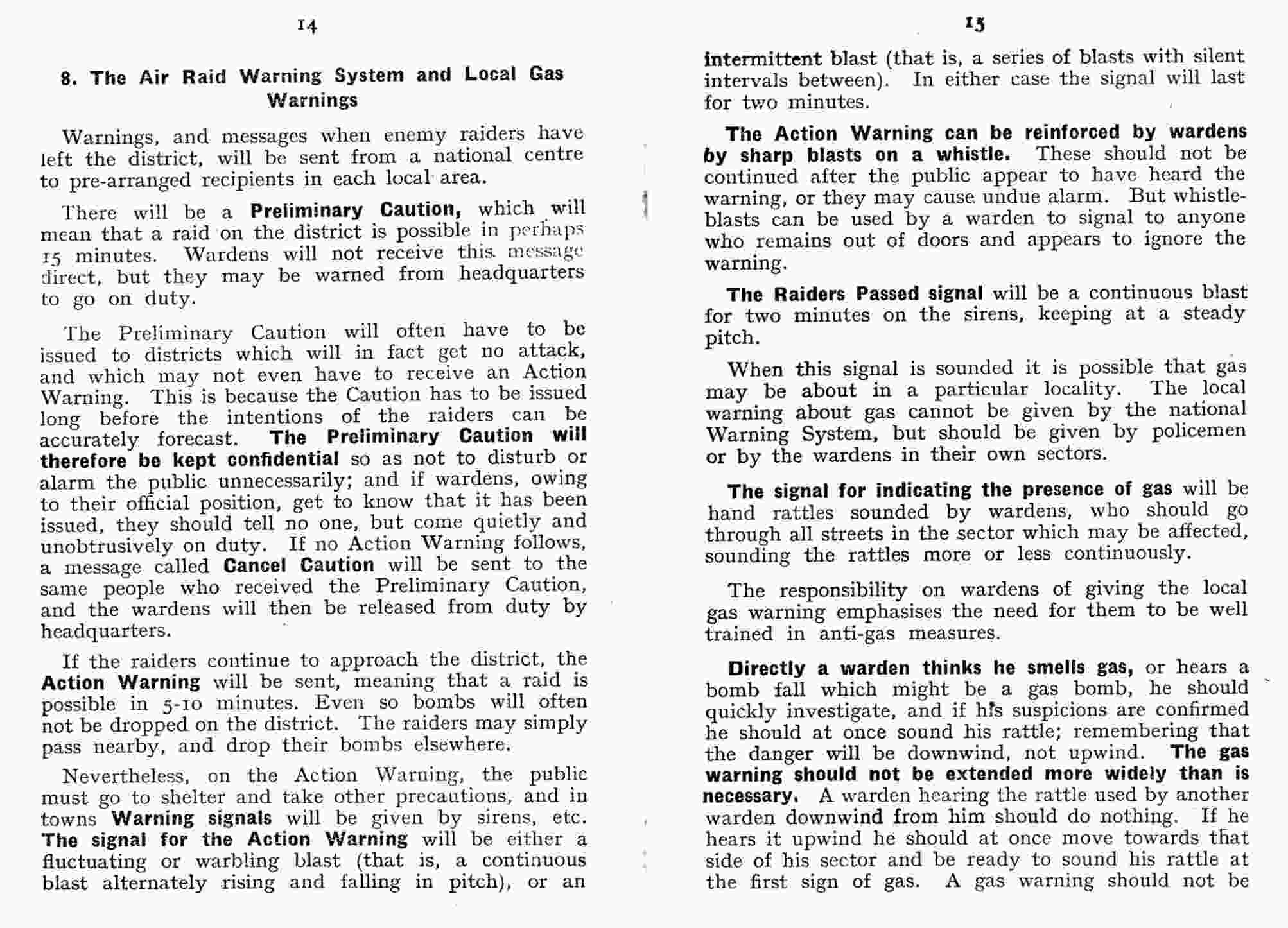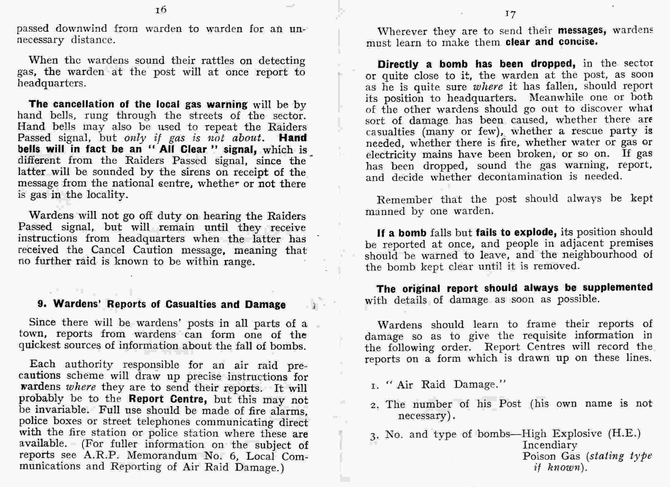 The signal for indicating the presence of gas will be hand rattles sounded by wardens, who should go through all streets in the sector which may be affected, sounding the rattles more or less continuously. The responsibility on wardens of giving the local gas warning emphasises the need for them to be well trained in anti-gas measures. Directly a warden thinks he smells gas, or hears a bomb fall which might be a gas bomb, he should quickly investigate, and if his suspicions are confirmed he should at once sound his rattle; remembering that the danger will be downwind, not upwind. The gas warning should not be extended more widely than is necessary. A warden hearing the rattle used by another warden downwind from him should do nothing. If he hears it upwind he should at once move towards that side of his sector and be ready to sound his rattle at the first sign of gas. A gas warning should not be passed downwind from warden to warden for an unnecessary distance. When the wardens sound their rattles on detecting gas, the warden at the post will at once report to headquarters. The cancellation of the local gas warning will be by hand bells, rung through the streets of the sector. Hand bells may also be used to repeat the Raiders Passed signal, but only if gas is not about. Hand bells will in fact be an “All Clear“ signal, which is different from the Raiders Passed signal, since the latter will be sounded by the sirens on receipt of the message from the national centre, whether or not there is gas in the locality. Wardens will not go off duty on hearing the Raiders Passed signal, but will remain until they receive instructions from headquarters when the latter has received the Cancel Caution message, meaning that no further raid is known to be within range. |