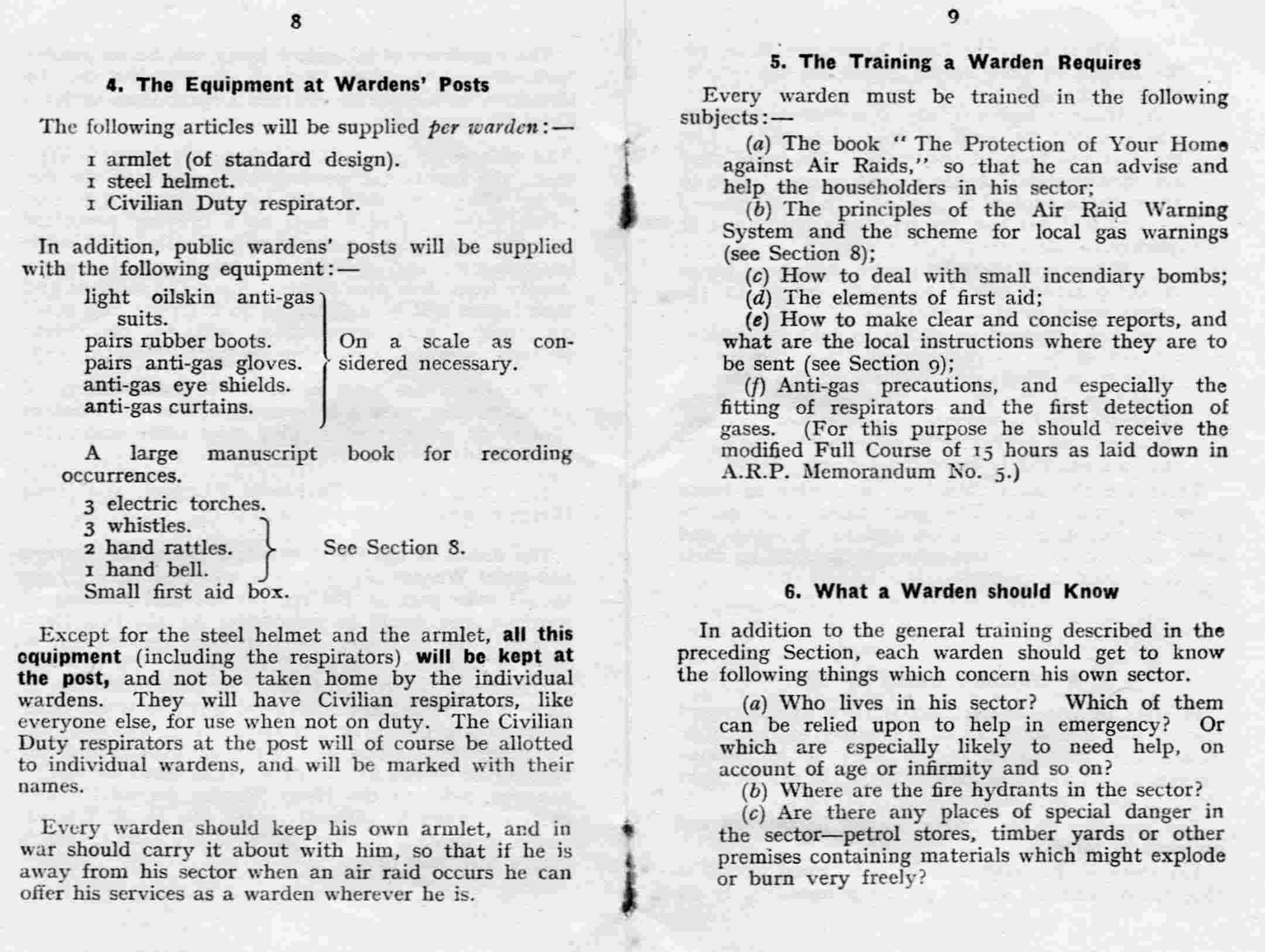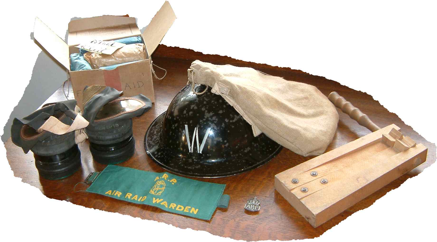 The picture shows the Warden's helmet, armband, badge, rattle, First Aid Kit, shoulder bag and gas masks. |