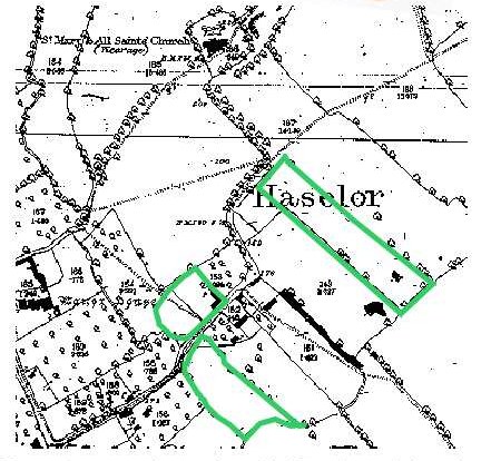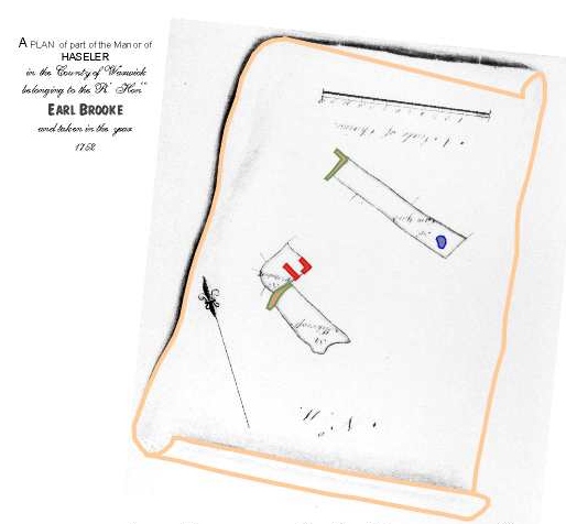 Map showing the old enclosures with house and barn belonging to "Little Manor". The top field enclosure on the map shows the angle of the old road to Haselor Church | Map shows where the old enclosures would have been on an 1887 Ordnance Survey Map |