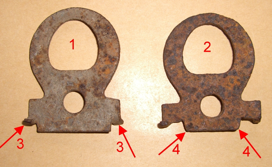 2. This is a well worn setting ring. Notice how short the bottom edge is, compared with setting ring no.1. Traps that are used a lot, you will find that the corners at no. 4 become rounded. These corners need to be at right angles, as in setting ring no. 1. A lot of filing has been done over 40 years to have a right angle corner. This setting ring is not going to be used again as the spring on the trap has broken. Ideally a new setting ring would have been better 20 years ago, but I have never found anybody who sold them separately. |