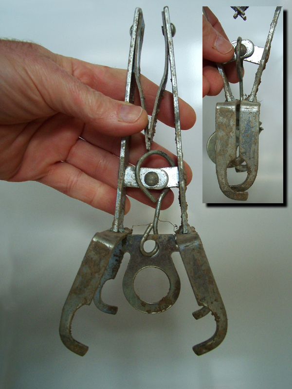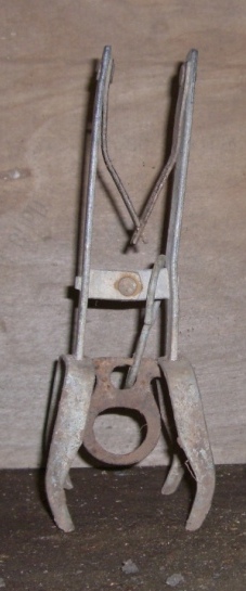 The wire holding the setting ring on a 1980's trap was completely the wrong length and shape for mole catching. The wire was so short that the setting ring could not drop down. |