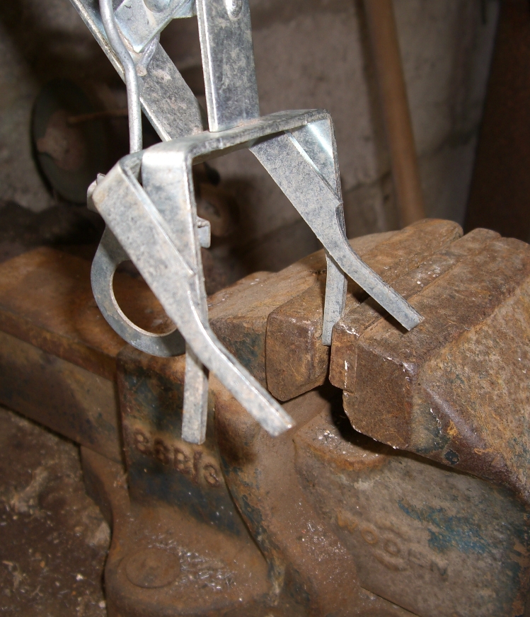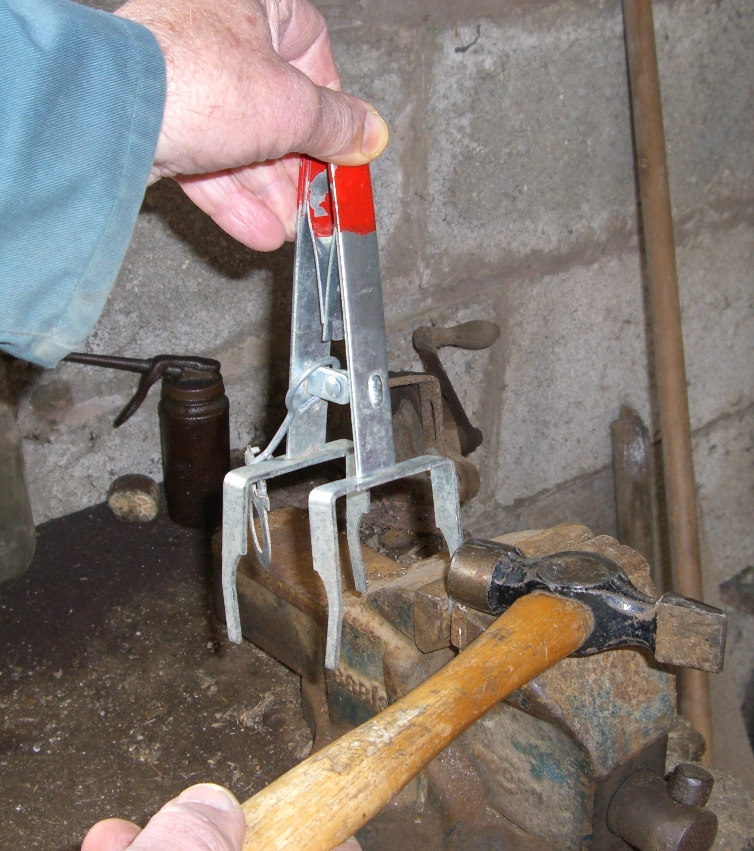 Only put the very end of each leg into the vice and hold the trap handles together. With a little pressure on the handles, pushing away from the hammer which is hitting the bottom of the leg with some force. The leg needs to have a small curve at the very bottom of the leg. Make sure the leg is bending near the vice and not higher up. Only do this if the trap handles are welded. Please read the article above for more accurate information. |
