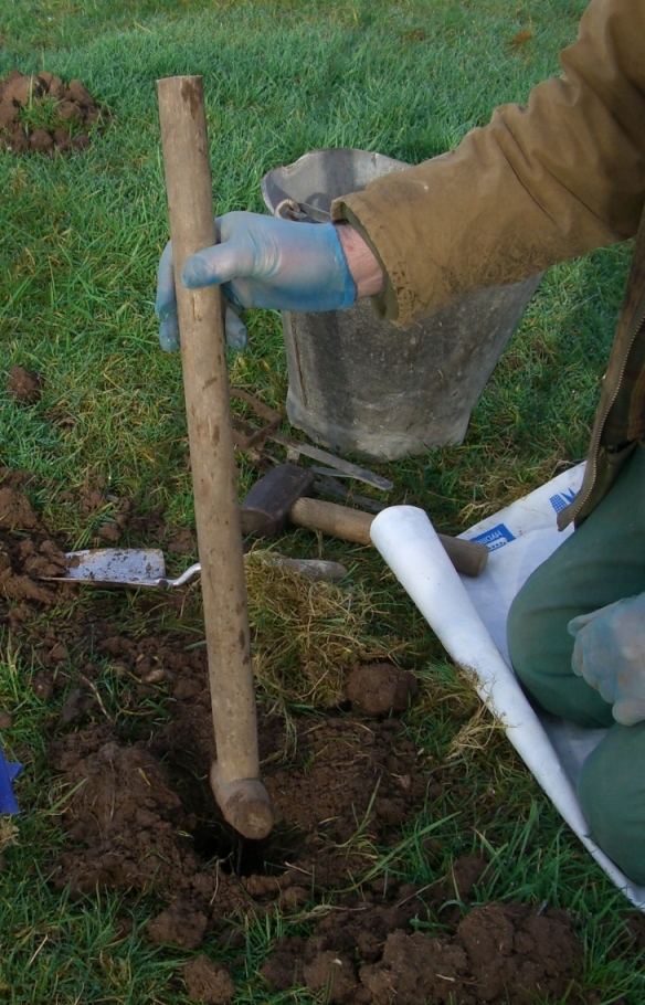 Some people have been making their own T-handle to compact the mole run but I am finding that it is better if the ends of the handle are tapered as on a commercially made one and not the same diameter for the whole length of the handle. This allows the handle to go up the mole run easier when compacting the soil. Only taper the sides that do not come in contact with the bottom of the run when compacting the soil. |