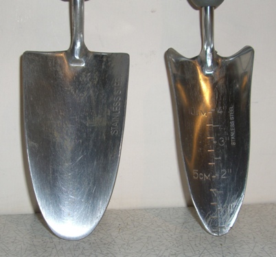 Trowel with a solid stem to the handle for strength, to make a hole, which is narrower than the width of a trap. | |
