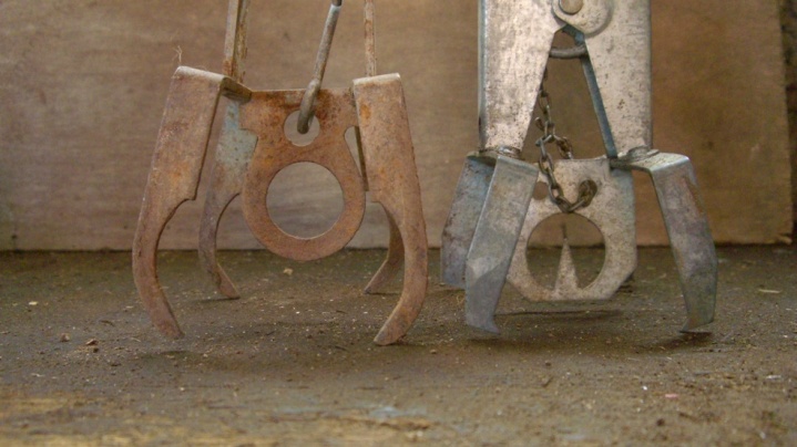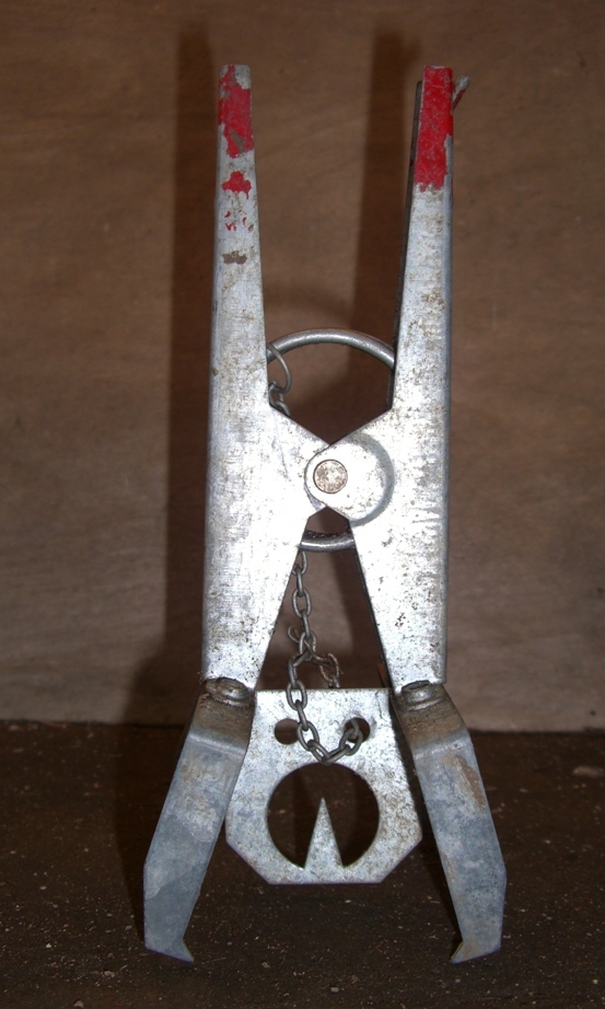 The trap on the left is a different design than what I have been use to. The picture on the right shows it more clearly. The legs of the jaws are shorter and the setting ring is almost on the floor. To set this trap in the mole run, the setting ring must be at the same height as the other trap, about ¾ of an inch off the ground. The feet on the jaws are not in the bottom of the mole run but on a ledge at the side of the hole. This means that when the trap is triggered, the jaws close in mid air onto the mole and not rubbing along the bottom of the mole run. This could be better for wet ground conditions. I have caught 2 moles so far with this trap and each mole was caught at the first attempt. The trap does not need altering for mole catching, except when the chain breaks! However I do not like the type of spring on the trap as what I have learnt in a short time is that the spring needs oiling often. You really can feel a huge difference when squeezing the handles together, to set the trap when oiled, than on other traps shown on this website. |