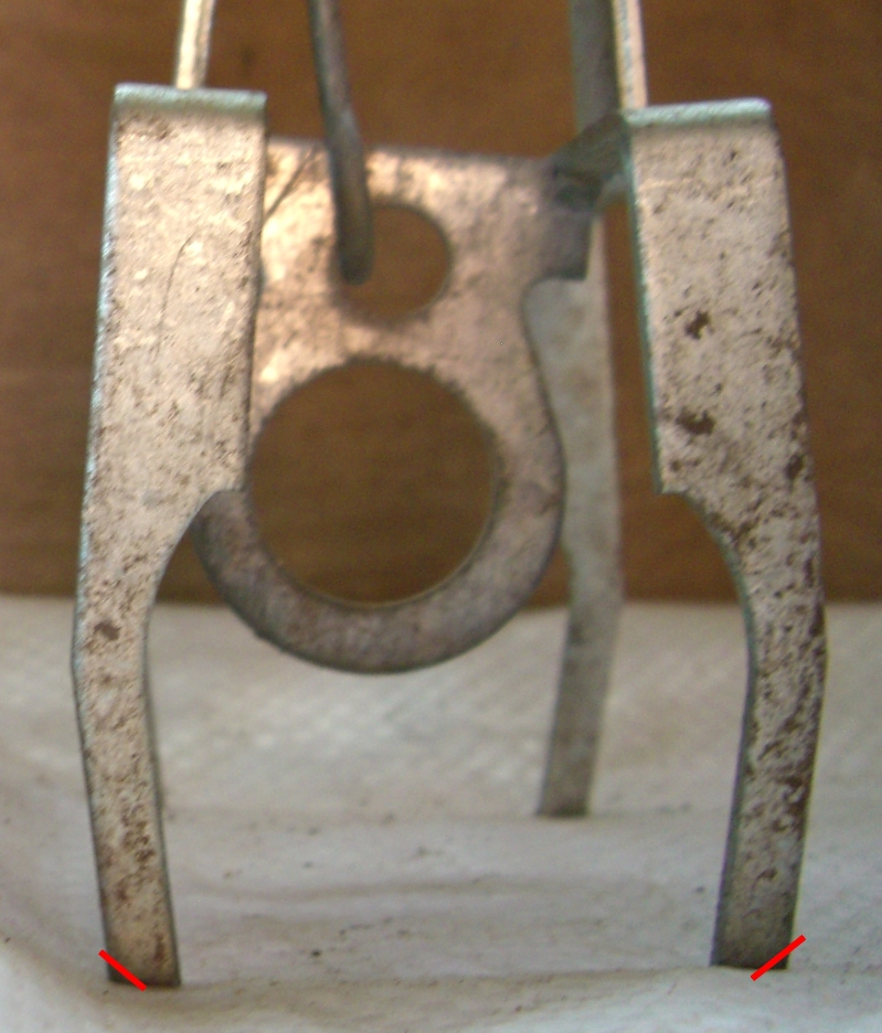 The trap used in the churchyard was one that I had modified, putting a curve on the legs, then prising the jaws outward and grinding off and curving the outside corners as shown by the red lines. |