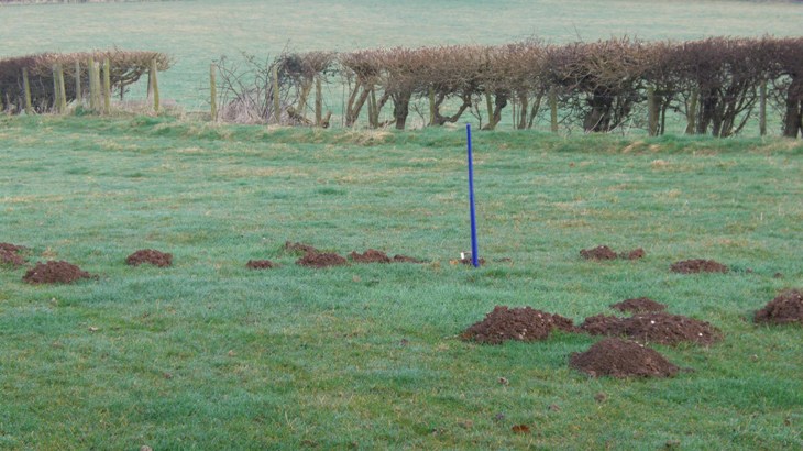 There is often a situation where you do not see clearly where the moles are going out into the middle of the field from the boundary fence to the latest molehills. This happens when the moles have been in the field a long time and the molehills near the boundary have disappeared. Look for length of an indentation in the ground, the width of a mole run. The ground above a mole run will often sink a bit and you can see this when the grass is short. |