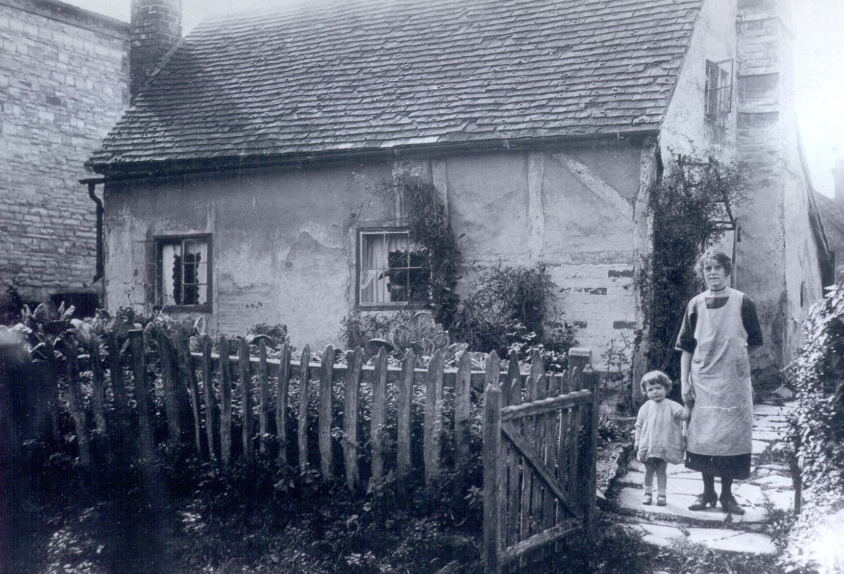 13. Walcote Manor. c1900. A document of the 1700's says this house is reputed to be the manor of Haselor & Walcote. In 1752 there was another farmhouse with 57 acres, which was more than the 49 acres at Walcote Manor, where the two thatched ricks stand in the picture or where you can now see a dutch barn and entrance to the farm. | 14. Lime Tree Cottage. 1927. This house stood next to Dingle Well and was demolished in the 1970's. The wash house is still there. The little girl, Beryl Price, in the picture wrote in her Journal that “The washhouse was outside and in it was a large boiler with a fireplace underneath. Mum had to get a good fire going to heat the water and then rub the clothes on a wooden board to get them clean. | ||