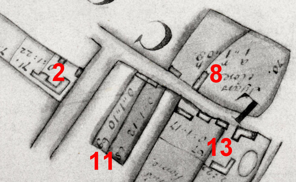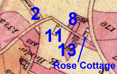 15. Holloway Cottages. These cottages have been built on an old road which went behind Rose Cottage and joined up to the old lane. Mary Savage, known as "The Witch", lived here in the 1870's. She has been described as ‘having a wrinkled face with a hooked nose that almost met her pointed chin’. The cottages have been rebuilt and now called Japonica Cottage. | 16. The Old Road. This is part of a map from a sale catalogue of 1806. The map shows that the road coming from the Walcote crossroads, went the other side of Rose Cottage following the high bank round to the lane going to Red Hill on the Turnpike Road leading from Stratford upon Avon to Alcester. (A46). | ||