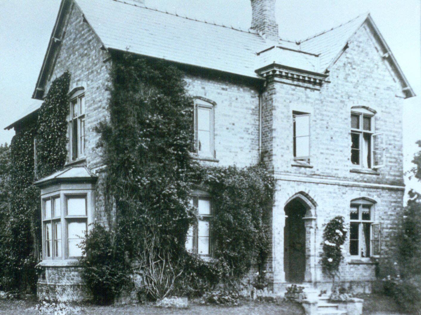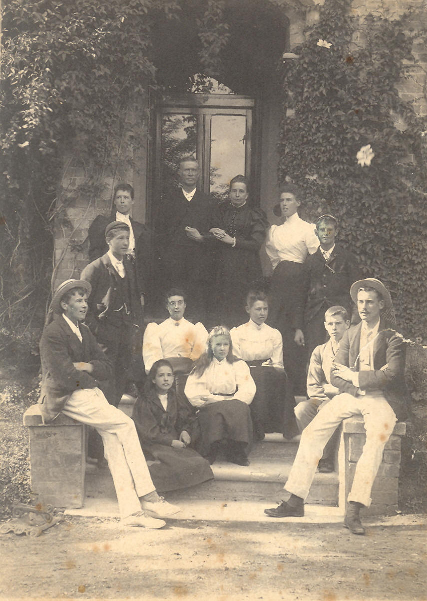 1. The Old Vicarage. Rev John Heath Sykes (who was vicar of Haselor Church for 45 years) with his wife and 11 of his 14 children, outside the front door, 1893. He succeeded in obtaining subscriptions to the amount of £1981 2s. 9d. towards the building of a vicarage house. The house was built in 1869, after the demolition of 2 cottages. |